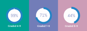 • 99% of GCSE entries were awarded grades 4–9, well above the national average of 67%